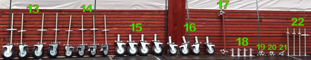 Opis: Zestaw do rusztowań jezdnych, umożliwiający łatwe przemieszczanie oraz precyzyjną regulację wysokości.